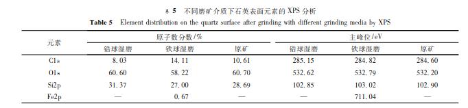 礦物表面性質(zhì)與其浮選行為密切相關(guān),采用 X 射線光電子能譜考察硅酸鹽礦物在不同磨礦介質(zhì)濕磨后表面元素變化的情況,確定礦物表面物質(zhì)的存在形式.不同磨礦介質(zhì)下,硅酸鹽礦物表面元素的 X 射線光電子能譜分析結(jié)果見表 1 ~ 表 5.表 1 ~ 表 5 的研究結(jié)果表明: 與原礦相比,( 1) 氧化鋯珠濕磨后,鋯英石表面 Zr 的原子數(shù)分數(shù)由 8. 30% 增加